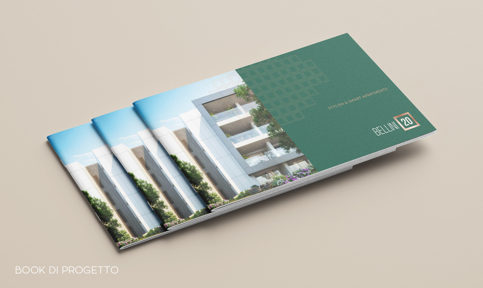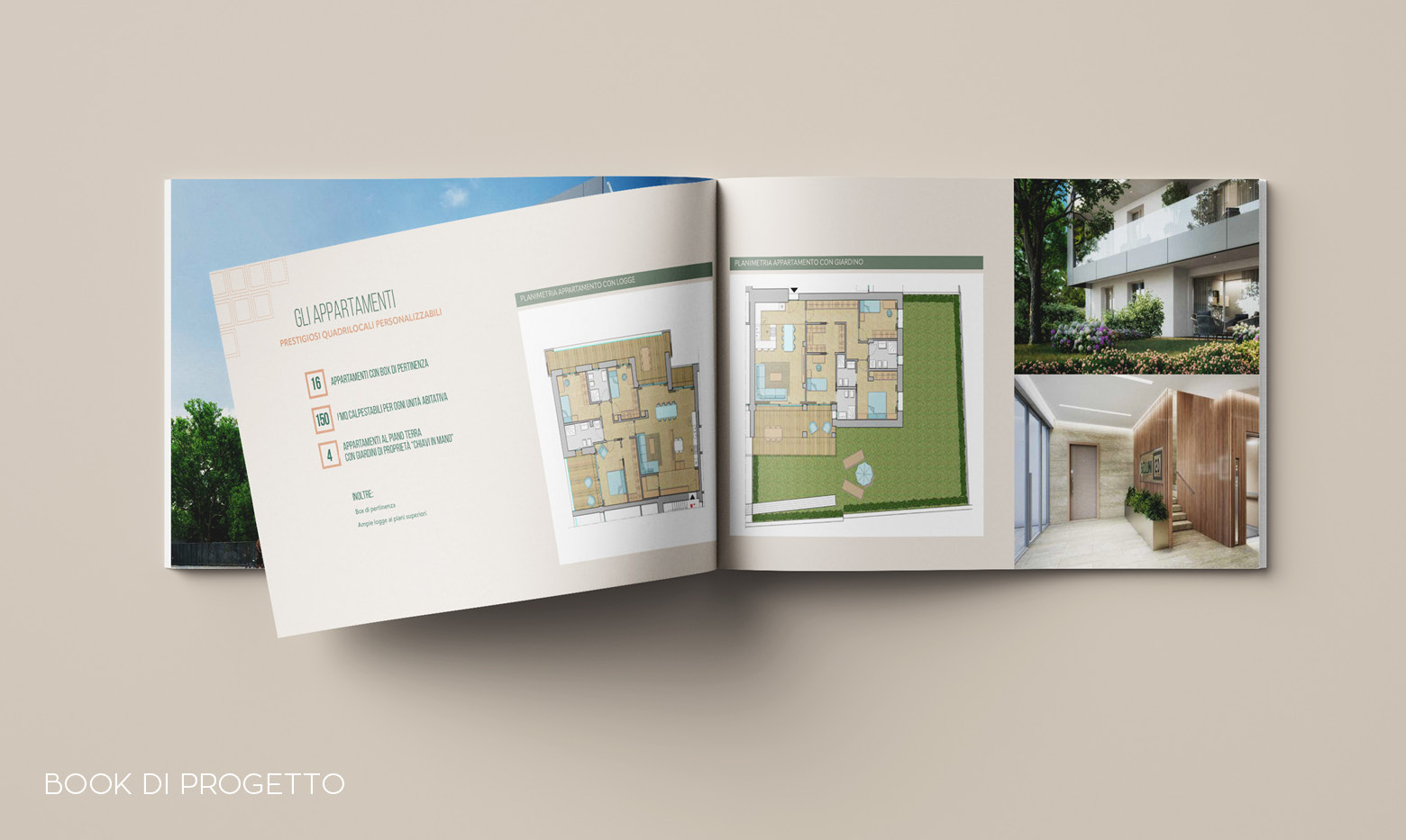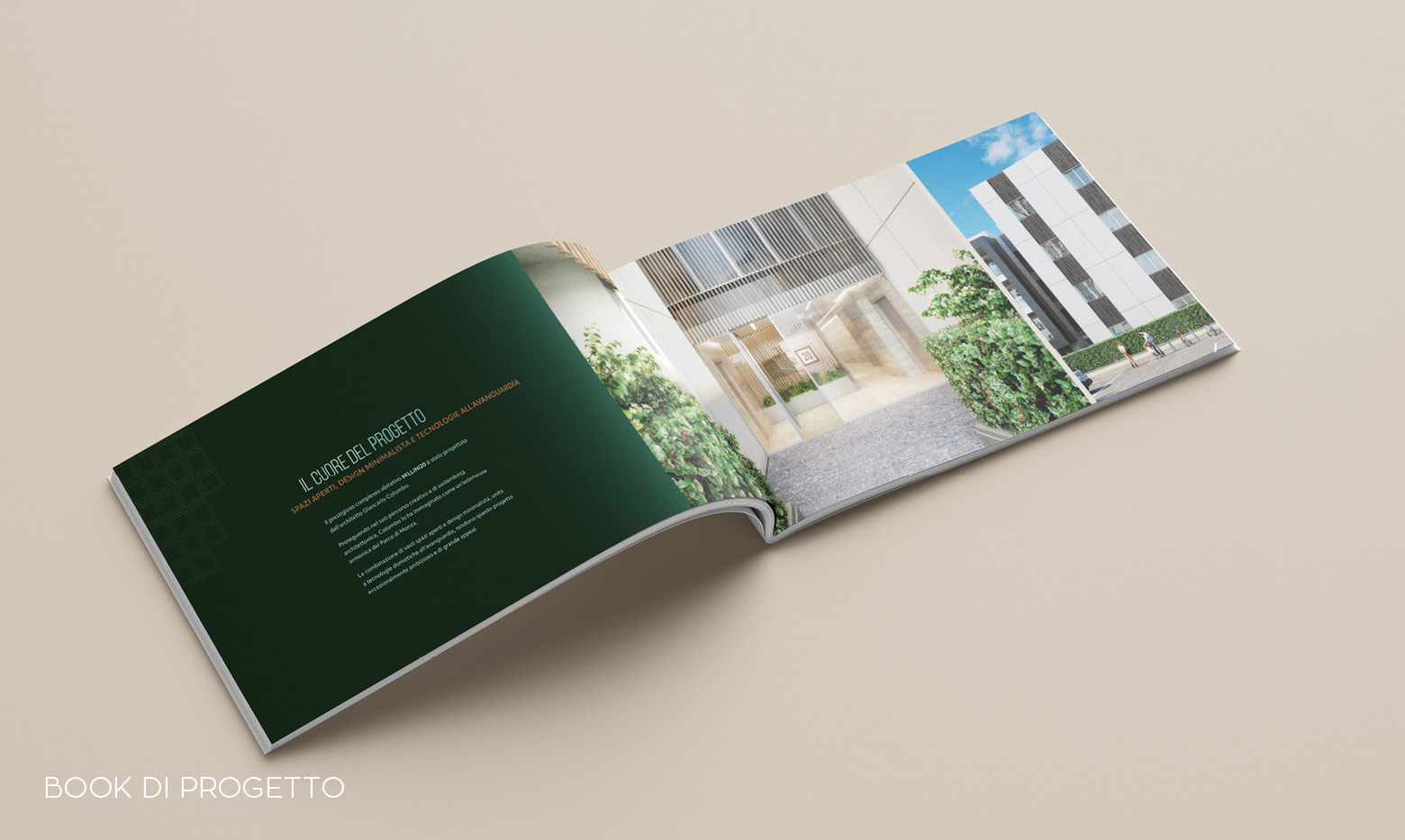Per la fase di marketing immobiliare, abbiamo creato un book di presentazione di alto pregio, concepito come un oggetto editoriale esclusivo. Il volume racconta nel dettaglio il progetto architettonico, le finiture e la visione estetica del complesso, diventando uno strumento di vendita raffinato e un cadeau di rappresentanza per gli acquirenti.